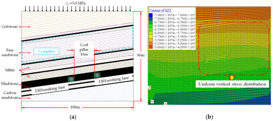 The software FLAC3D 3.0, which was developed by the ITASCA company in Minneapolis, MN, USA, can accurately simulate the elastoplastic change law of the coal pillar from the load to the final yield limit, and according to the grid characteristics and the constraints imposed by the model, the stress–strain value of a unit in different stages can be effectively determined. Thus, through a field investigation, we obtained the relevant parameters required for numerical simulation and substituted the coal and rock parameters affected by goaf water into the numerical model. Finally, using the solid-flow coupling criteria built into FLAC3D, we can observe how seepage water affects the rock and coal and find the direction of the water flow vector.