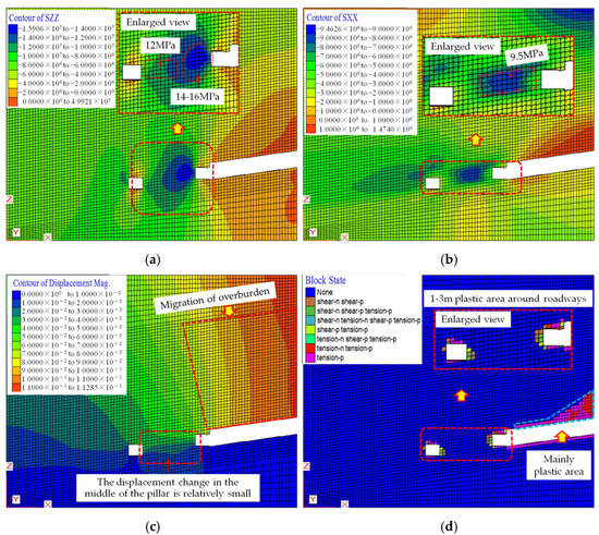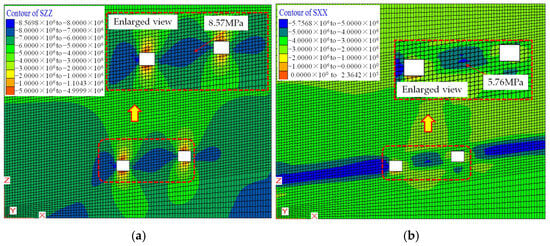 The change in the stress field is the force source for coal and rock deformation. The displacement amount and plastic area of the roadways are essentially caused by stress concentration, so it is particularly important to determine the influence of the coal pillar on the stress distribution characteristics of the surrounding rock during the mining process (as shown in Figure 6).