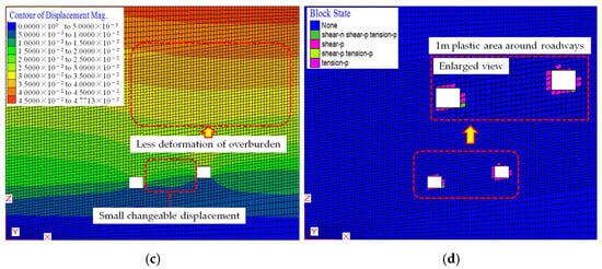 Thus, under the influence of roadway excavation, the coal–rock stress state is broken, the original rock stress field changes, and the vertical stress is mainly concentrated on the roadways. The pressure area is about 8.57 MPa, and the stress superposition state of the coal vertical stress state presents an arch shape; thus, the stress on both sides of the roadway roof is reduced. The horizontal stress is distributed in the coal pillar, which produces a small stress concentration zone, and the average stress value is nearly 5.76 MPa. The displacement changes in overburden and the coal pillar are relatively small. Overall, the entire horizontal stress of the model does not change much, and the stress is distributed relatively uniformly. The change mainly occurs locally in the model, indicating that the roadways and coal pillar are currently less affected by horizontal stress, and the pillar remains stable. The distribution rule of the plastic zone indicates that the primary plastic zone extends 1 m around roadways. Additionally, the plastic zone of the 1301 roadway is slightly larger than that of 1303 roadway. This indicates that the 1301 roadway experiences greater stress due to factors such as the inclination angle of the 3# coal seam.