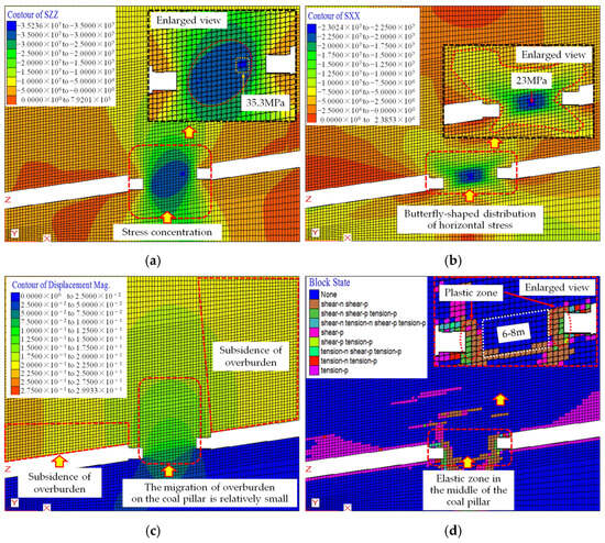 Numerical simulation characteristics after excavation of all working faces. (a) Vertical stress characteristics; (b) horizontal stress characteristics; (c) displacement distribution characteristics; (d) characteristics of the elastoplastic area.