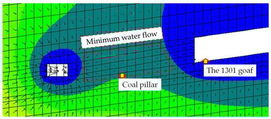 Due to the on-site mining situation, the 1301 working face has been completed, and the 1303 working face is currently being mined. Figure 9 accurately illustrates the impact of goaf water on surrounding rocks, roadways, and the coal pillar in this situation. The figure shows a flow vector diagram of the V3 aquifer with the working face excavation. According to the figure, the tops of the 1301 and 1303 working faces are the main flow directions of crack water, where the water located in the 1301 goaf extends laterally along the 3# coal seam bottom plate, and the final part of the water flow may enter from the 1303 auxiliary transport bottom plate. Thus, during the whole process, no goaf water crosses the coal pillar into the roadway, indicating that the coal pillar plays an effective barrier role in the numerical simulation.