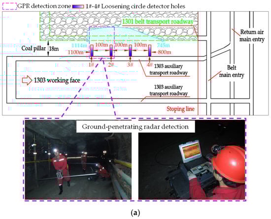In the geological exploration of mines, acoustic and electromagnetic wave detection techniques have shown good results in analyzing the degree of rock fracture development, especially in determining the loose circle of the rock around roadways, which has attracted the attention of many scholars []. Therefore, to further assess the structural features of the coal pillar affected by the goaf water, ground-penetrating radar (GPR) and loosening circle detection were utilized to evaluate the stability of the pillar in the study zone. The detection distribution is illustrated in Figure 10. Among these techniques, GPR is a commonly used means of scanning surrounding rock structures on a large scale, and its working principle is mainly based on the reflection of electromagnetic waves in different media for geological evaluation.