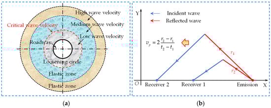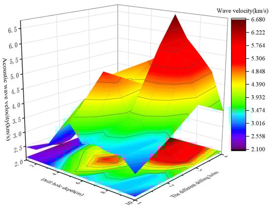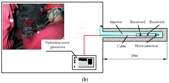 Furthermore, loosening circle detection mainly detects the broken surrounding rock range based on the different velocities of sound waves in different media [], and the wave velocity increases as the number of cracks in the surrounding rock decreases (in Figure 11a). Before detection, the borehole should be filled with water to ensure the stable propagation of sound waves (in Figure 10b). Subsequently, the transmitter of the loosening circle detector is excited by electrical pulse signals to generate transient sound wave signals. These signals propagate in the rock and are received by two receivers. Based on the time difference between the arrival of sound waves at different receivers, the wave velocity of the coal pillar at different depths can be obtained (in Figure 11b).