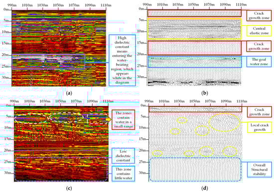 Figure 12 reflects the GPR detection results of the roadway within the range of 990–1110 m, where Figure 12a,b reflects the structural characteristics of the coal body in the southern portion of the roadway (unaffected by goaf water), and Figure 12c,d reflects the structural characteristics of the coal body in the northern section of the roadway (the goaf and coal pillar).