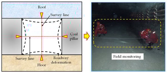 On the basis of geophysical monitoring, to more intuitively observe the structural deformation of the coal pillar affected by water, two cross-section measuring zones are set in the roadway near the coal pillar (in Figure 14). The 1# cross-section is unaffected by goaf water, and the 2# cross-section is located in the zone affected by water. After 16 days of monitoring, the data can be summarized.