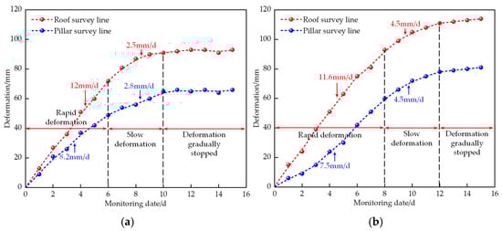 Deformation analysis of the roadway near the coal pillar. (a) Monitoring results of the 1# cross-section; (b) monitoring results of the 2# cross-section.