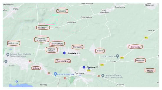 Water from the intake in Tłokinia Wielka is used to meet the social and living needs of residents and entrepreneurs in the following localities: Tłokinia Wielka (426 people), Tłokinia Kościelna (630 people), Tłokinia Mała (145 people), Tłokinia Nowa (79 people), Nędzerzew (51 people), part of Zduny (300 people), Rożdżały (141 people), Kobierno (160 people), Borów (344 people), Zmyślanka (62 people), Sierzchów (462 people), Modła (44 people) and Warszew (114 people). This gives approximately 2958 people in total (Figure 1). The region covered by the rural water supply network in Tłokinia Wielka is an area where the leading activity is agricultural production, especially horticulture. Due to the above, water is also used for agricultural and horticultural purposes. The furthest point supplied from the Tłokinia Wielka intake is Modła in the Opatówek commune.
