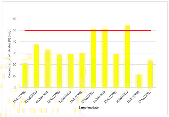 Concentration of nitrates (V) in the Tłokinia Wielka water supply network in 2020–2023. Note: red line—acceptable concentration.