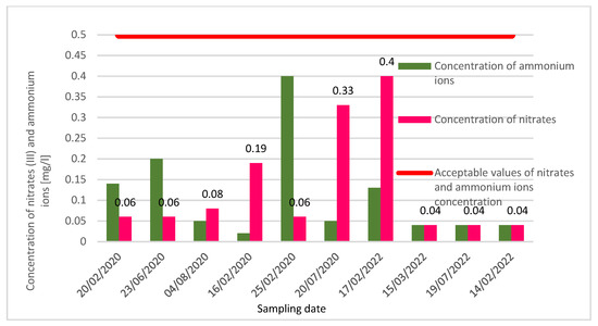 As far as the concentration of ammonium ions and nitrates (III) (Table 1, Figure 3) is concerned, their values are lower than the limit of quantification in the months when the parametric value of nitrates (V) is exceeded. This means that nitrate (V) contamination is permanent. In February 2021, a sharp growth (0.40 mg/L) in the concentration of ammonium ions (nitrogen) was observed, as well as an increase (0.06 mg/L) in the value of nitrates (III); the concentration of nitrates (V) was within the normal limits and amounted to nearly 30 mg/L. A similar situation was observed in June 2020. The concentrations of ammonium ions and nitrates (III and V) were 0.20 mg/L, 0.06 mg/L and 37.0 mg/L, respectively. Such an increase in ammonium nitrogen concentration indicates fresh contamination and oxidation reactions of ammonium salts into stable nitrates.