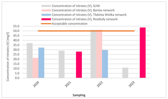 On the basis of the results of the analyses performed for water samples from the Tłokinia Wielka waterworks (Table 1, Figure 2), it can be inferred that the concentration of nitrates (V) in the water supply network seasonally rises above the acceptable limit. The concentration was exceeded in the first quarter of 2022 in the network in the village of Borów and at the water purification plant in Tłokinia Wielka, and later in February 2023 in the network in the village of Rożdżały. In 2023, the test was repeated after 3 days, and the nitrate (V) concentration decreased to 23 mg/L in the village of Rożdżały and to 11 mg/L at the water purification plant. Water mixing was used to improve water quality so that the concentration of nitrates (V) did not exceed the recommended value. Water from well No. 1, containing large amounts of nitrates (V), was mixed with water from well No. 2 (which alone is unable to provide enough water for the entire supply network of the Tłokinia Wielka waterworks). In this way, water recipients from Tłokinia Wielka and the surrounding area had good-quality water. The research shows that a quarter of the collected and analysed samples had exceeded nitrate (V) concentrations.