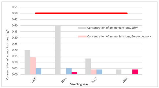 Concentration of ammonium ions in the Tłokinia Wielka water supply network in 2020–2023 depending on the place of sampling. Note: red line—acceptable concentration.