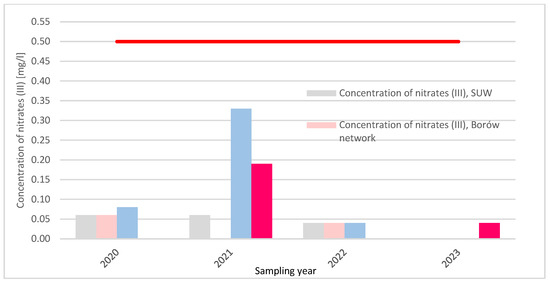 Concentration of nitrates (III) in the Tłokinia Wielka water supply network in 2020–2023 depending on the place of sampling. Note: red line – acceptable concentration.