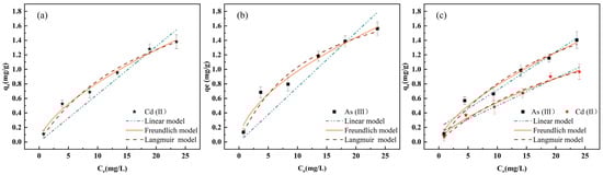 Fitting of isotherm models for the adsorption of single system As(III) (a), Cd(II) (b), and binary system (c) on PBS.