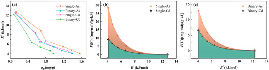 Figure 2b,c shows the approximate potential energy distributions (F(E*)) of As(III) and Cd(II) adsorbed on PBS, derived using the Freundlich isotherm model. The absolute site frequency distribution value of As(III) was larger than that of Cd(II), indicating a concentrated distribution of high-energy sites with more adsorption sites having high adsorption energies for As(III) compared to that of Cd(II) [56]. Cd(II) exhibited lower E* values ranging from 4.11 to 12.75 kJ/mol in the single system compared to As(III) with a 4.09–12.76 kJ/mol range. In contrast, the Em values of Cd(II) and As(III) decreased in the presence of both solutes, indicating that adsorption in the binary system affects the ability of Cd(II) and As(III) to occupy high-energy adsorption sites on PBS.
