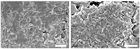 Microplastics demonstrate a variety of adsorption behaviors for heavy metals. The adsorption capacities of different MPs are influenced by factors such as their structure, hydrophobicity, functional groups, rubbery or glassy phases, particle size, and specific surface area [31]. PBS is a semi-crystalline polymer with amorphous and crystalline areas [12]. According to literature statistics, PBS has a specific surface area of 0.601 m2/g, a total pore volume of 0.00128 cm3/g, an average pore size of 10.57 nm, and a water contact angle of 74.09 [12,23]. Figure 3 displays the uneven shape of PBS, with a relatively flat and wrinkled surface that potentially offers lots of adsorption sites. PBS is an aliphatic copolyester with longer hydrocarbon repeating units and a more flexible molecular structure than the aliphatic homopolymer PLA [10]. Aliphatic polyesters can be broken down by the simple hydrolysis or enzymatic cleavage of their ester groups by enzyme activity. In addition, PBS is regarded as a rubber polymer [8]. Rubber polymers exhibit a pliable structure with numerous intermolecular cavities, and their molecular weight is closely linked to the active sites formed through molecular forces during adsorption [31].