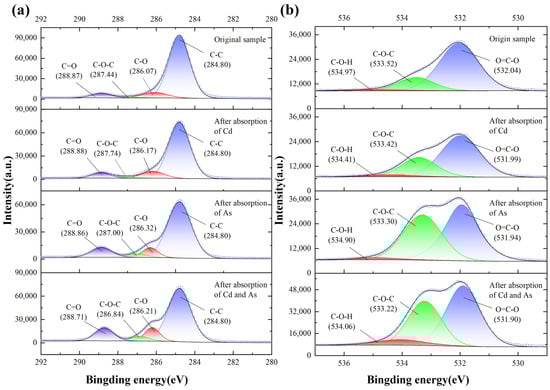 Heavy metals primarily adsorb onto MPs through various mechanisms, including electrostatic interactions, Van der Waals forces, hydrogen bonding, π-π bonding, complexation, and other mechanisms [44,50]. In addition, studies have confirmed the adsorption mechanisms of heavy metals, and adsorption behaviors may vary depending on the type of MPs and ambient conditions. Figure 4 presents XPS high-resolution spectra before and after PBS adsorption on Cd(II) and As(III) under various systems to explain the adsorption mechanism. After the adsorption of pollutants, there was a noticeable shift and reduction in the binding energy of O1s. This indicates a possible trapping process between the oxygen-containing functional groups of PBS and the pollutants, likely due to the π-π interactions and complexation between PBS and pollutants [17]. Figure 4a displays the original C1s spectra divided into four peaks at 248.80 eV, 286.07 eV, 287.44 eV, and 288.87 eV binding energies, representing C-C, C-O, C-O-C, and C=O groups, respectively [36,67]. Three distinct peaks located at 532.04 eV, 533.52 eV, and 534.97 eV were identified in the O1s spectra (Figure 4b), corresponding to the O=C-O, C-O-C, and C-O-H functional groups, respectively [12].