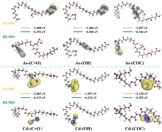 Distribution of HUMOs, LUMOs of PBS, Cd(II) and As(III) conjugates. Carbon, hydrogen, oxygen, arsenic, and cadmium atoms are depicted in gray, white, red, purple, and yellow, respectively.