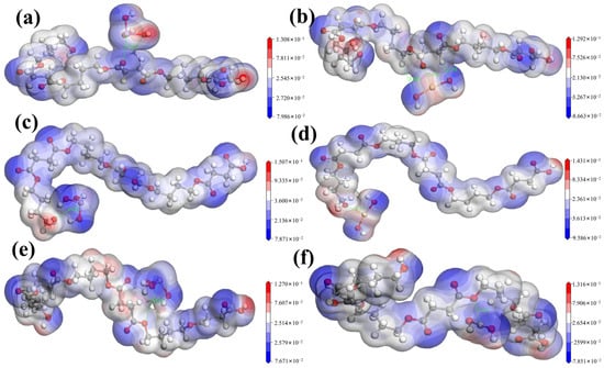 Distribution of electrostatic potential after PBS adsorption. (a,b) are As(III) and Cd(II) adsorbed with C=O sites; (c,d) are combined with OH; and (e,f) are adsorbed with COC sites, respectively. Carbon, hydrogen, oxygen, arsenic, and cadmium atoms are depicted in gray, white, red, purple, and yellow, respectively.