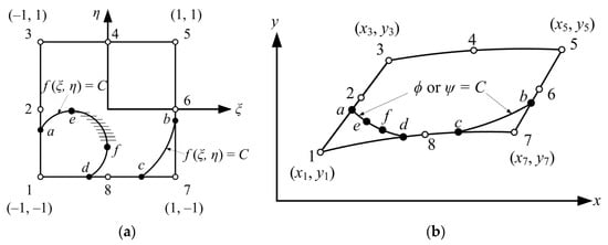 In the following, it will be assumed that a dataset of nodal potential and stream values and their corresponding nodal coordinates has been obtained from a finite-element analysis using quadratic eight-node quadrilateral isoparametric elements. The element size is fine enough to rule out the presence of a closed loop of equipotential line or streamline in an element. For the sake of clarity and completeness, some of the derivations of Singh and Saini [] are reproduced in Section 2. However, the notation and element node numbering convention used by Smith et al. [] are adopted because a contour plotting program of their open-source modular programs is adapted to solve the example problems, which will be described toward the end of this paper.
