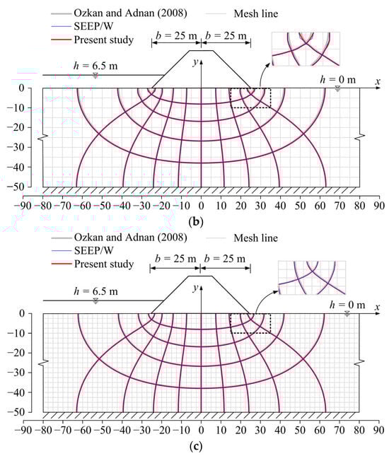 As shown in Figure 2, a steady-state flow occurs in a finite aquifer beneath a levee due to a fluctuating river head. The levee has a bottom width of 50 m, with the upstream water level maintained at 6.5 m and the downstream water level maintained at 0 m. The aquifer has a depth of 50 m but is considered to have infinite length. It remains fully saturated, with an assumed saturated hydraulic conductivity of 0.001 m/s. Ozkan and Adrian [] developed the exact analytical solutions of the equipotential line and streamline for the levee under-seepage flow, incorporating time-dependent upstream boundary conditions to account for fluctuating water levels. In the case depicted in Figure 2, the upstream and downstream water levels are held constant at 6.5 m and 0 m, respectively, simplifying the boundary condition to a steady-state scenario. This steady-state assumption eliminates the time-dependent component, making it a limiting case for Ozkan and Adrian’s exact analytical solutions. Once the contour values of the equipotential lines and streamlines are determined, the coordinates of points on equipotential lines and streamlines can be calculated by using the exact analytical solution. The resulting flow nets, derived from the analytical solutions, are shown as thick gray curves in Figure 2a–c.