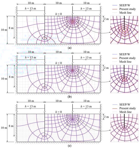 Comparisons between the equipotential lines and streamlines for a double-wall cofferdam obtained using the modified algorithm and those obtained by SEEP/W: (a) element size = 2 m × 2 m; (b) element size = 1 m × 1 m; (c) element size = 0.5 m × 0.5 m.