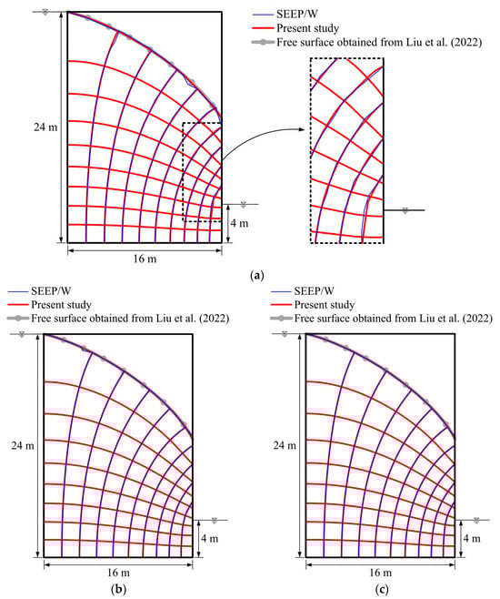 Comparisons between the free surfaces and equipotential lines plotted using the modified algorithm and those obtained from Liu et al. [] and SEEP/W: (a) element size = 4 m × 4 m; (b) element size = 2 m × 2 m; (c) element size = 1 m × 1 m.