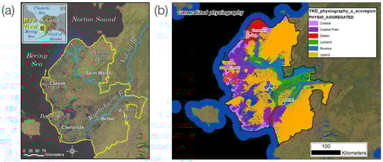Yukon–Kuskokwim Delta study region. (a) The left panel shows the study region outlined in yellow with an inset showing the location of the YKD in southwestern Alaska. (b) The right panel shows the physiographic regions of the Yukon–Kuskokwim Delta. The dots represent field plots in Frost et al., 2021 [32].
