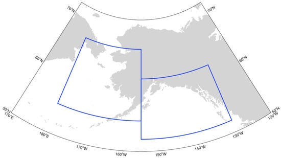 Boundaries used for storm counting algorithm (Zhang et al., 2004) [42] for the Bering Sea (left blue box) and Gulf of Alaska (right blue box).
