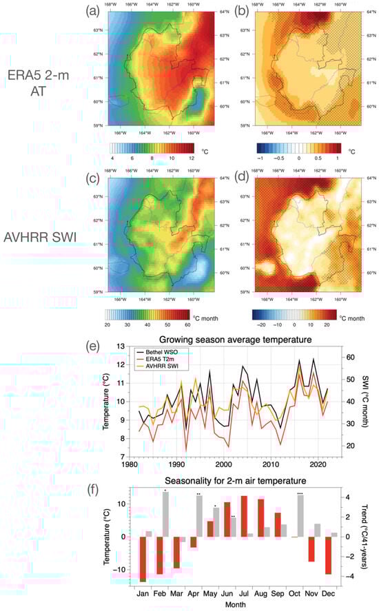 Growing season (May–September) temperature climatology, trends, and seasonality from ERA5 for 1982–2022. (a) ERA5 2 m air temperature; (b) ERA5 2 m temperature spatial trends; (c) AVHRR summer warmth index (SWI); (d) AVHRR SWI spatial trends; (e) time series of average 2-m air temperature (orange), SWI (red), and Bethel 2 m temperature (black); (f) seasonality plot showing average monthly temperatures (red) and trends (gray). Statistical significance for spatial figures are designated by hatching for >95% confidence level, and for the seasonality figure by asterisks at 90% (*), 95% (**), and >99% (***) levels.