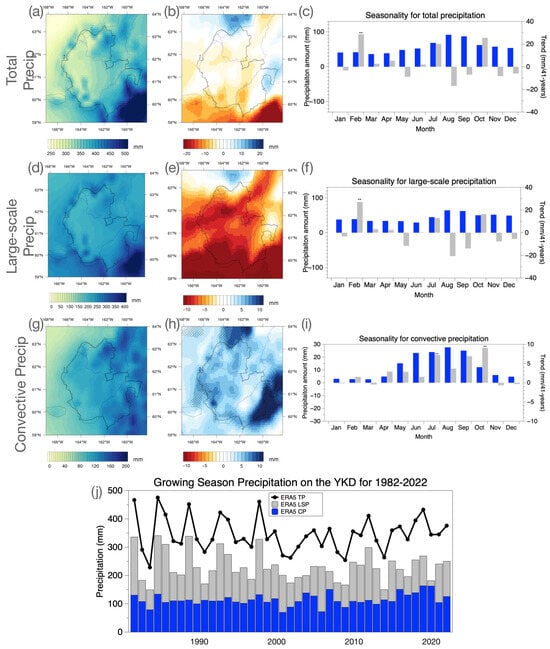Growing season precipitation climatology, trends, and seasonality from ERA5 for 1982–2022. (a) total precipitation climatology; (b) total precipitation trends; (c) total precipitation seasonality; (d) large-scale precipitation climatology; (e) large-scale precipitation trends; (f) large-scale precipitation seasonality; (g) convective precipitation climatology; (h) convective precipitation trends; and (i) convective precipitation seasonality. (j) is a summative figure with bars of convective (blue) and large-scale (gray) precipitation, total precipitation (black line), and Bethel WSO (purple). Note the scales for precipitation amount and trends are on the left and right, respectively, of the seasonality plots. In plots c,f,i, blue bars represent monthly averages and gray bars represent monthly trends. Statistical significance for spatial figures are designated by hatching for >95% confidence level, and for the seasonality figure by asterisks at 5% (**) level.