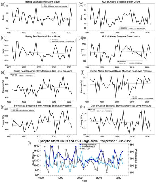 Time series for seasonal storms in the Bering Sea (left column) and the Gulf of Alaska (right column). (a,b) total seasonal storm counts; (c,d) total seasonal storm hours; (e,f) overall seasonal storm minimum sea level pressure (hPa); and (g,h) average seasonal storm sea level pressure (hPa). (i) synoptic storm hours from the Bering Sea and the Gulf of Alaska (GOA) with large-scale precipitation in the YKD study region. Storm region outlines are shown in Figure 2.