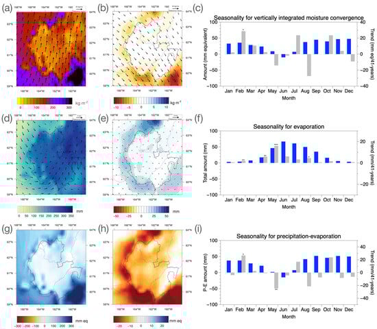 Atmospheric moisture averages, trends, and seasonalities from ERA5 for the vertically integrated moisture convergence and flux (top row), evaporation and wind (middle row), and precipitation minus evaporation (bottom row) in the YKD for 1982–2022. (a) VIMC (contours) and moisture flux (arrows) climatology; (b) VIMC (contours) and moisture flux (arrows) (kg m−1 s−1) trends; (c) VIMC seasonality; (d) evaporation (contours) and 10m wind (arrows) climatology; (e) evaporation (contours) and 10m wind (arrows) (m s−1) trends; (f) evaporation seasonality; (g) P-E climatology; (h) P-E trends; and (i) P-E seasonality. Reference vectors for moisture flux and wind speed are given above panels (b,e). Note the scales on the seasonality plots for moisture amount and trends are on the left and right, respectively. In plots c,f,i, blue bars represent monthly averages and gray bars represent monthly trends. Statistical significance for spatial figures are designated by hatching for >95% confidence level, and for the seasonality figure by asterisks at 90% (*), 95% (**), and >99% (***) levels.
