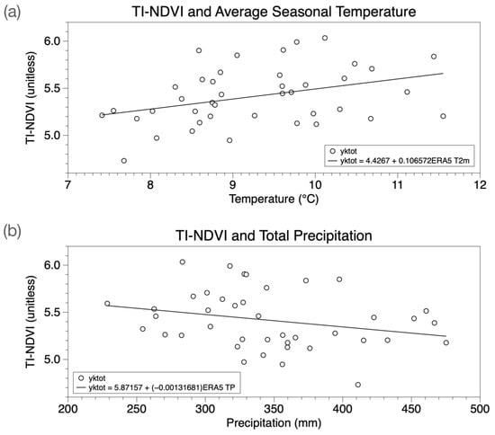 Scatter plots of (a) TI-NDVI and average seasonal temperature; and (b) TI-NDVI and seasonal total precipitation for the YKD region. The units of NDVI are unitless, temperature in °C, and precipitation in mm.