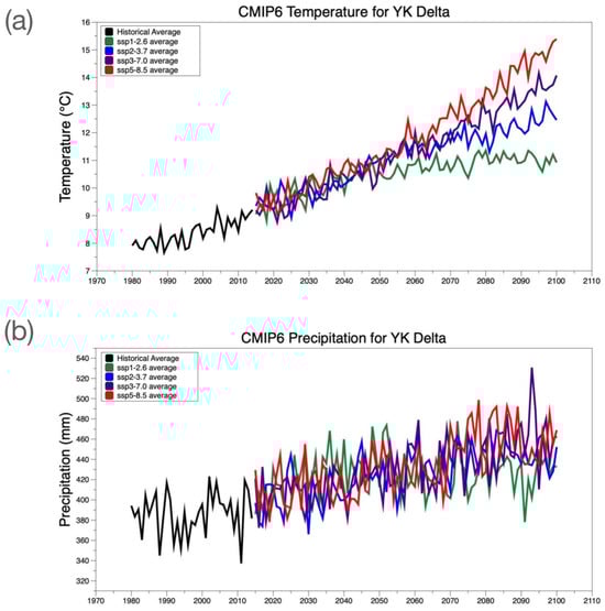 Growing season temperature and precipitation projections from CMIP6 (Figure 9) show increasing trends for temperature and precipitation scenarios. Projections for temperature (Figure 9a) show similar interannual variability to the modeled historical climate runs (black) and all SSPs show similar trends until about 2050, followed by a notable spread among SSP scenarios. Total precipitation projections also show similar interannual variability, compared to the historical runs, but continue to increase together with little notable spreading among SSP scenarios. The lowest SSP scenario (green) shows some lower values near the end of the century. The average modeled historical temperature for 1980–2014 is 8.4 °C and the projected temperatures for the final decade (2091–2100) are 11.0 °C (SSP1-2.6), 12.5 °C (SSP2-4.5), 13.6 °C (SSP3-7.0), and 14.8 °C (SSP5-8.5). The average modeled historical precipitation for 1980–2014 is 386.2 mm and the projected precipitation for the final decade (2091–2100) are 424.2 mm (10% increase; SSP1-2.6), 442.8 mm (15% increase; SSP2-4.5), 464.4 mm (20% increase; SSP3-7.0), and 452.3 mm (17% increase; SSP5-8.5). CMIP6 projections indicate that the interplay of increasing temperatures and moderately increasing precipitation could affect the moisture availability at the surface and impact plant growth in the YKD. Temperatures during the warmest month of July limit the advance of the tree line into Arctic tundra and it appears that threshold will be crossed, if it has not been already, as temperatures are projected to increase through the end of the century.