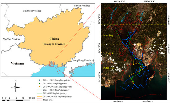 In these surveys, a total of 34 and 62 samples were collected for model construction and validation, respectively. Additionally, data from 32 samples collected by the Guangxi Academy of Sciences during a shipboard survey in Qinzhou Bay from September 2015 to January 2016, as well as 23 samples collected by the Marine Environmental Monitoring Center of Guangxi Zhuang Autonomous Region in Tieshan Port on 4 November 2021, were included to assess the generalization and applicability of the retrieval model. The sampling locations for the three monitoring campaigns in Qinzhou Bay in 2015 and 2023 are displayed in Figure 1.