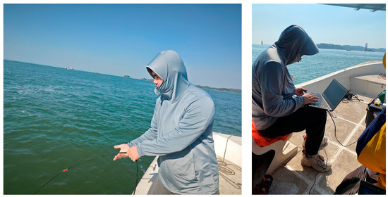 A total of 96 sampling points were established in Qinzhou Bay, Guangxi, on 30 May and 20–21 November 2023. The sampling points, numbered from 1 to 96, were selected based on accessibility and suitability. At each point, SSS data were measured multiple times, and the corresponding sea surface spectral reflectance was collected concurrently. The coordinates of each sampling point, in the World Geodetic System 1984 (WGS 84) format, were recorded using a handheld Global Positioning System (GPS) device. Figure 2 presents the measurements and recordings made during the sampling campaigns.