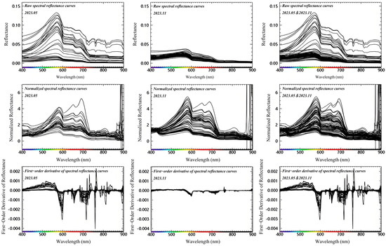 where represents remote sensing reflectance, stands for water-leaving radiance, denotes sky radiance, is the standard panel radiance, and is the standard panel reflectance, which is 0.99. Additionally, represents the air–water interface reflectance, which is considered to be 2.5% when the wind speed is around 5 m/s.