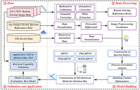 The technical framework of this study, shown in Figure 6, begins with obtaining GF-1 WFV remote sensing data synchronized with field measurements, which were combined with in situ spectral reflectance and SSS data to construct and validate the SSS retrieval models. Data processing involved key preprocessing steps, including radiometric calibration, atmospheric correction, geometric correction, normalization, and first-order differentiation, along with outlier filtering to ensure data quality. We then conducted statistical analyses to verify correlations between spectral indices and in situ SSS data, selecting those with the strongest correlations as model inputs. Using BPNN as the model framework, we introduced optimization algorithms—PSO, IGWO, and WSO—to enhance model performance. Model evaluations with field data allowed us to identify the optimal model for SSS retrieval in Qinzhou Bay. To ensure stability and reliability for practical applications, we assessed the model’s generalization capabilities across time and space using third-party data. Finally, we performed a monthly SSS retrieval for Qinzhou Bay in 2023, analyzing the spatial distribution and temporal variations of SSS across the Inner Bay, Bay Neck, and Outer Bay and exploring its relationship with factors such as climate change, freshwater inputs, and mariculture activities.