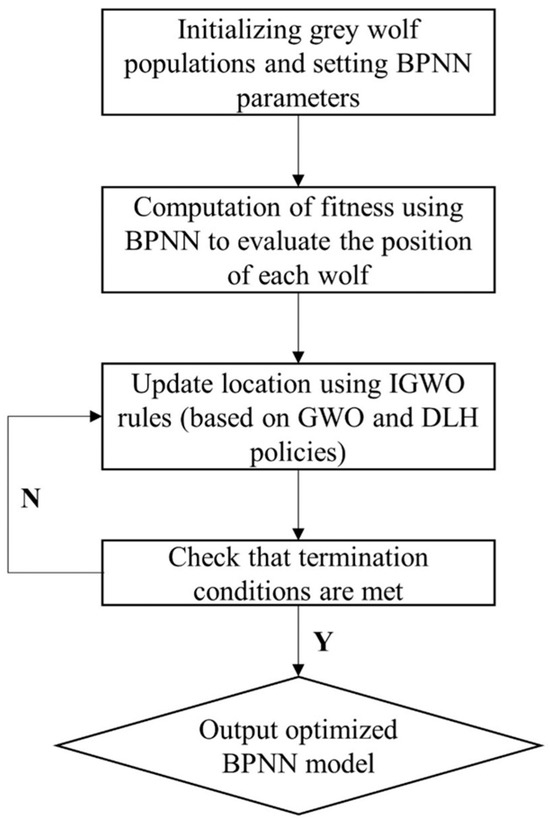In IGWO–BPNN, the IGWO algorithm is used to optimize the weights and thresholds of the BPNN. The process of optimizing the BPNN by IGWO is shown in Figure 8.