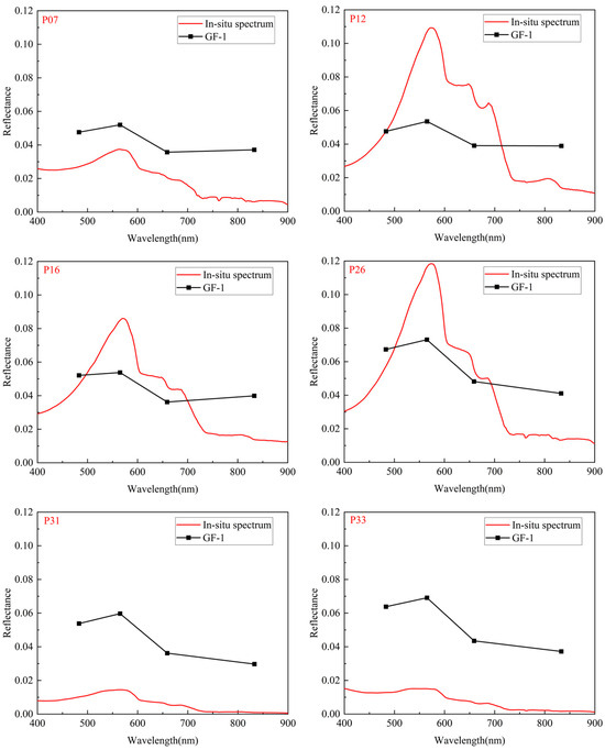 Comparative analysis of water reflectance curves from GF-1 satellite imagery and empirical spectra measurements.