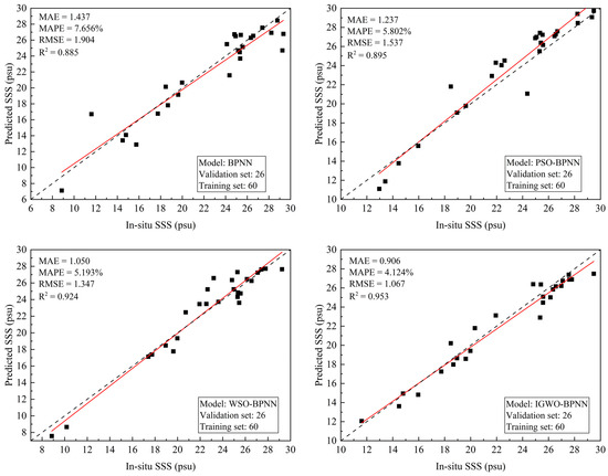 This study compared the performance of the IGWO, PSO and WSO algorithms in optimizing a BPNN for SSS retrieval. The IGWO algorithm achieved superior results due to its nonlinear convergence mechanism and dynamic weight optimization, which effectively avoids local optima and enhances search efficiency and prediction accuracy. The IGWO–BPNN model demonstrated significantly improved performance in SSS retrieval, outperforming other models and exhibiting robust generalization capabilities. Preliminary assessments using independent datasets revealed slight reductions in accuracy by 10.9% and 8.6% in Qinzhou Bay and Tieshan Port, respectively, indicating stable predictive performance and broad applicability. The model was constructed and validated using datasets covering a salinity range of 8.857–29.631 psu, reflecting the observed variability of SSS in Qinzhou Bay, from low-salinity conditions influenced by freshwater inflows to higher salinity levels closer to the open ocean. In 2023, the spatial and temporal variability of SSS in Qinzhou Bay was notable, with distinct variations observed between the Inner Bay, Bay Neck, and Outer Bay. Influenced by freshwater inflows, the Inner Bay exhibited lower salinity during the rainy season, while the Outer Bay, more connected to the open ocean, maintained consistently higher salinity levels. These findings underscore Qinzhou Bay’s complex hydrodynamic environment, marked by seasonal and regional variations in salinity.