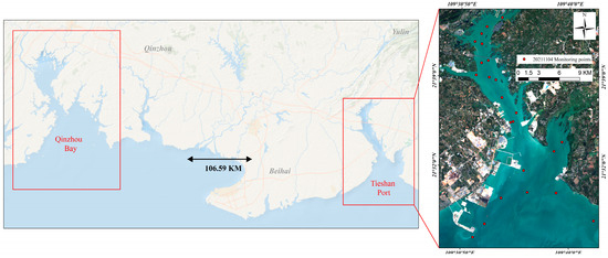 Qinzhou Bay is located to the south of Qinzhou City, Guangxi Zhuang Autonomous Region, China, between longitudes 107°27′ and 109°56′ east and latitudes 21°35′ and 22°41′ north (Figure 1). It borders Fangchenggang City to the east and Beihai City to the west and faces the Beibu Gulf. The region has a tropical maritime climate, with an average annual temperature of approximately 22 °C, abundant rainfall, and an active hydrological cycle. The salinity in Qinzhou Bay is influenced by various factors, including climate, river inputs, tides, and ocean currents, and exhibits significant temporal and spatial variability. Qinzhou Bay serves as an important habitat for coral reefs, mangroves, and numerous marine organisms. The health of its ecosystem is closely linked to the stability of salinity levels, as changes in salinity directly affect the structure and function of biological communities [40].