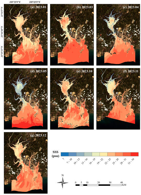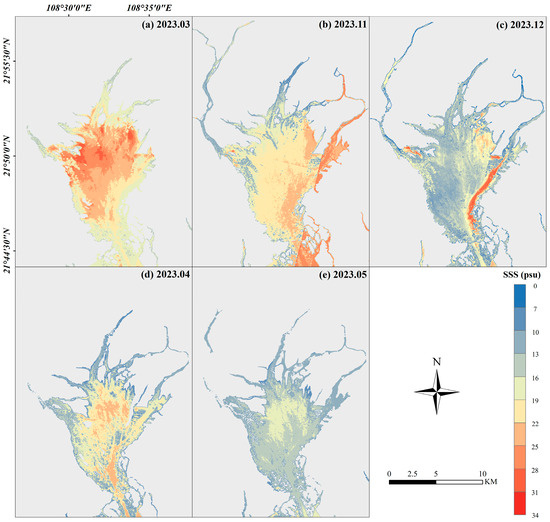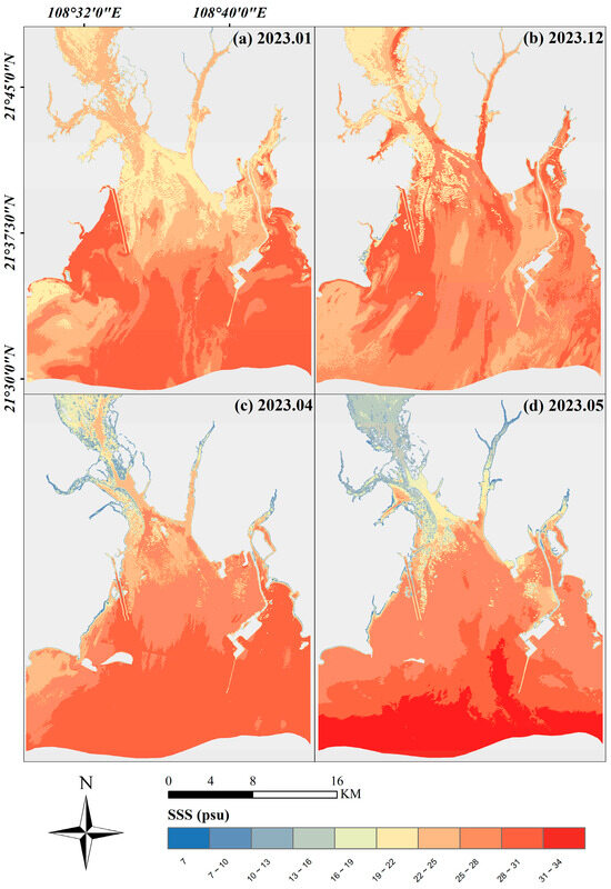 In coastal areas, changes in SSS are particularly pronounced due to the interactions between human activities, climate change, riverine freshwater inputs, and complex topography and geomorphology [14]. Studying the spatial and temporal variations of coastal SSS can enhance our understanding of the mixing process between freshwater and seawater, which is crucial for monitoring algal growth [15,16,17] and helps track the transport pathways of pollutants [18,19]. This is significant for maintaining the marine ecological balance, promoting the sustainable development of coastal fishery resources, and supporting the prosperity of harbor economies.