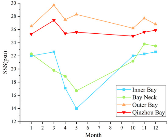 Based on field data, a three-dimensional distribution map of SSS was created (Figure 3), illustrating the distribution characteristics of SSS within the study area. The results indicated a distinct spatial trend, with lower SSS values in the northern part and higher values in the southern part of the region. SSS gradually increased from the Inner Bay to the Bay Neck and subsequently to the Outer Bay. Freshwater input from rivers emerged as a significant factor influencing the SSS distribution, especially within the Inner Bay, where the convergence of nearby rivers contributes to a notable reduction in SSS, particularly during the rainy season. Ocean circulation also plays a critical role; as the bay exchanges water with outer ocean currents, areas with oceanic inflow exhibit higher SSS values. Consequently, SSS values increase progressively from the Inner Bay to the Outer Bay as oceanic waters mix with the bay’s inner waters.