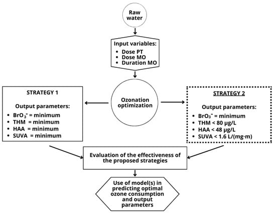 To optimise the input values of the ozonation process, it was decided to adjust the output values according to two strategies. Strategy 1 was to reduce all parameters simultaneously to minimum values and Strategy 2 was to reduce bromate to the lowest possible concentration without the concentrations of the other selected output parameters exceeding 80% of the recommended or maximum allowable values, which is shown in the flow chart (Figure 1).