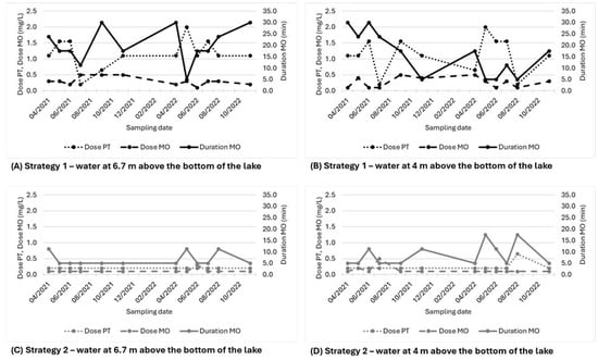 Input parameters (ozone dose in PT (pretreatment) and MO (main ozonation), ozonation duration in MO) for Strategy 1 (A,B) and Strategy 2 (C,D) for different raw waters extracted at 6.7 m above the lake bottom (A,C) and 4 m above the lake bottom (B,D).