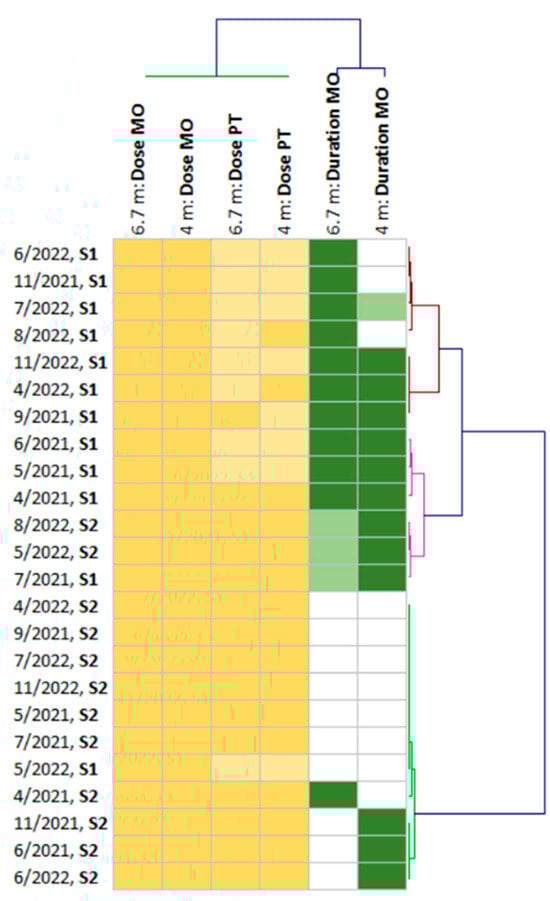 The quantitative values are shown in Figure 2, but the qualitative differences of the input parameters (dose of PT and MO) are presented with a heat map in Figure 3 where a specific grouping of the parameters of raw water samples mainly from Strategy 2 with very low output parameters (white boxes) can be observed, although the input parameters have the same values, except for the sample collected in May 2022, where the dose of PT was the highest (=2), resulting in the same outputs as the samples with lower input values.