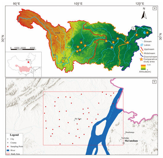 A total of 43 shallow groundwater samples were collected from domestic wells in rural households (Figure 1b), with each sample directly obtained from villagers’ self-used boreholes (depth: 5–15 m) using pre-cleaned 500 mL polyethylene bottles. The pH of water samples was measured using a portable multi-parameter instrument (SX731, Shanghai Sanxin Instrument Factory, Shanghai, China). Samples were collected in pre-cleaned, high-density polyethylene bottles, and were washed 3 times with water samples to be taken before sampling. Water samples for metal analysis are acidified to pH < 2.