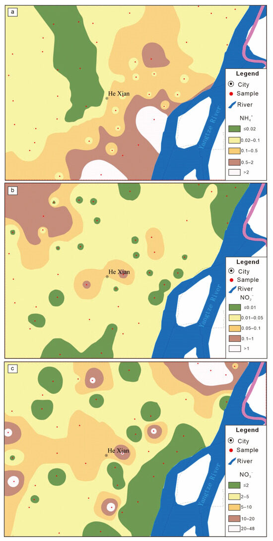 Distributions of concentrations in (a) NH4+, (b) NO2−, (c) NO3− for the groundwater from the Hexian area, China.