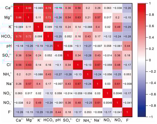The correlation matrix of 12 kinds of water chemistry was constructed as shown in Figure 3. Chloride ion (Cl−) is regarded as a conservative tracer in groundwater systems [17]; this is because it scarcely participates in physical, chemical, or microbial interactions and is highly mobile within aquifers [18]. Its concentration is primarily regulated by natural hydrochemical processes and anthropogenic pollution sources [19]. Thus, Cl− can serve as a reliable indicator for tracing nitrate sources. In this study, SPSS software was employed to analyze the correlation between the concentrations of NO3− and Cl− in the study area. The results indicated that NO3− was positively correlated with Cl− (Figure 3). This synergistic increase pattern strongly implies that nitrate pollution in groundwater mainly stems from domestic sewage and livestock manure [20].